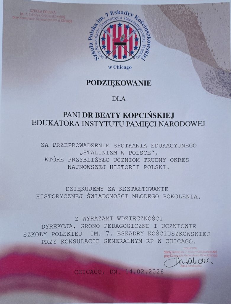W ramach tegorocznej edycji Przystanku Historia IPN Chicago naszą szkołę odwiedziła Pani dr Beata Kopcińska, reprezentująca Instytut Pamięci Narodowej.